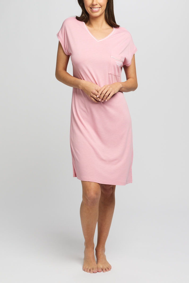 Knee length, v neck , front pocket night dress which drapes comfortably over the body.
