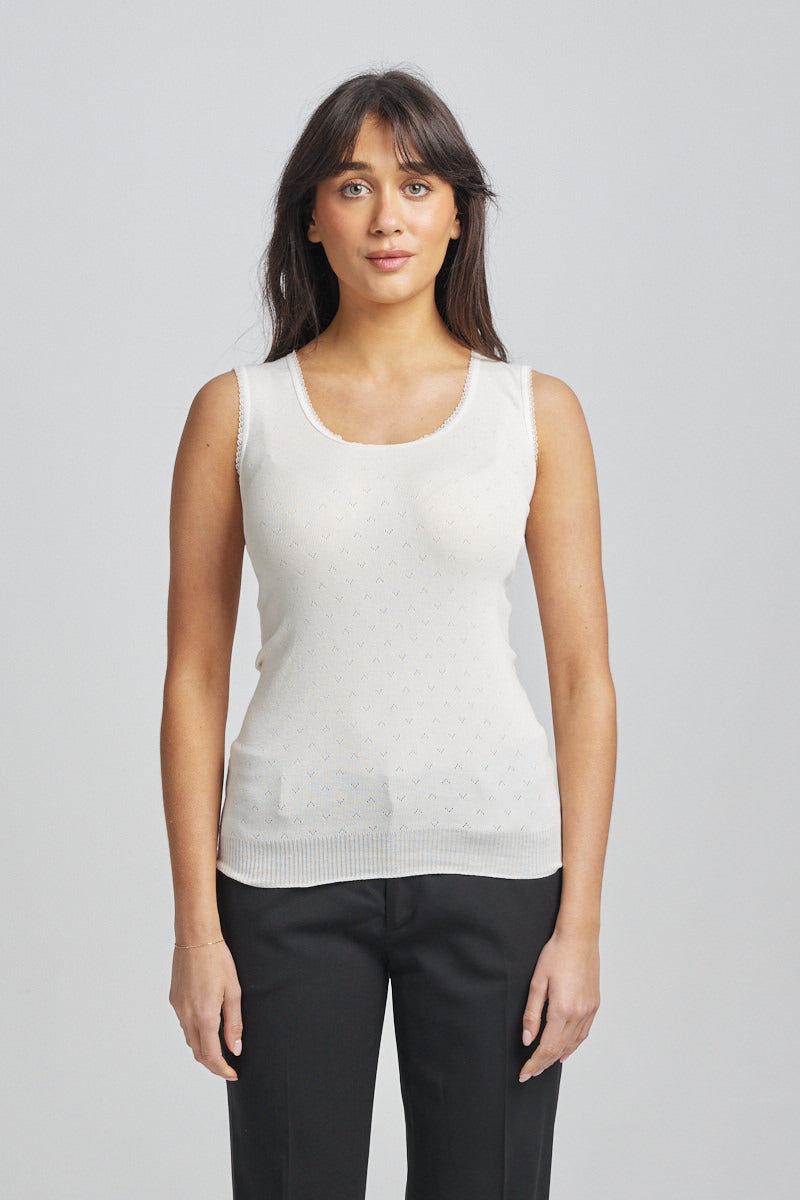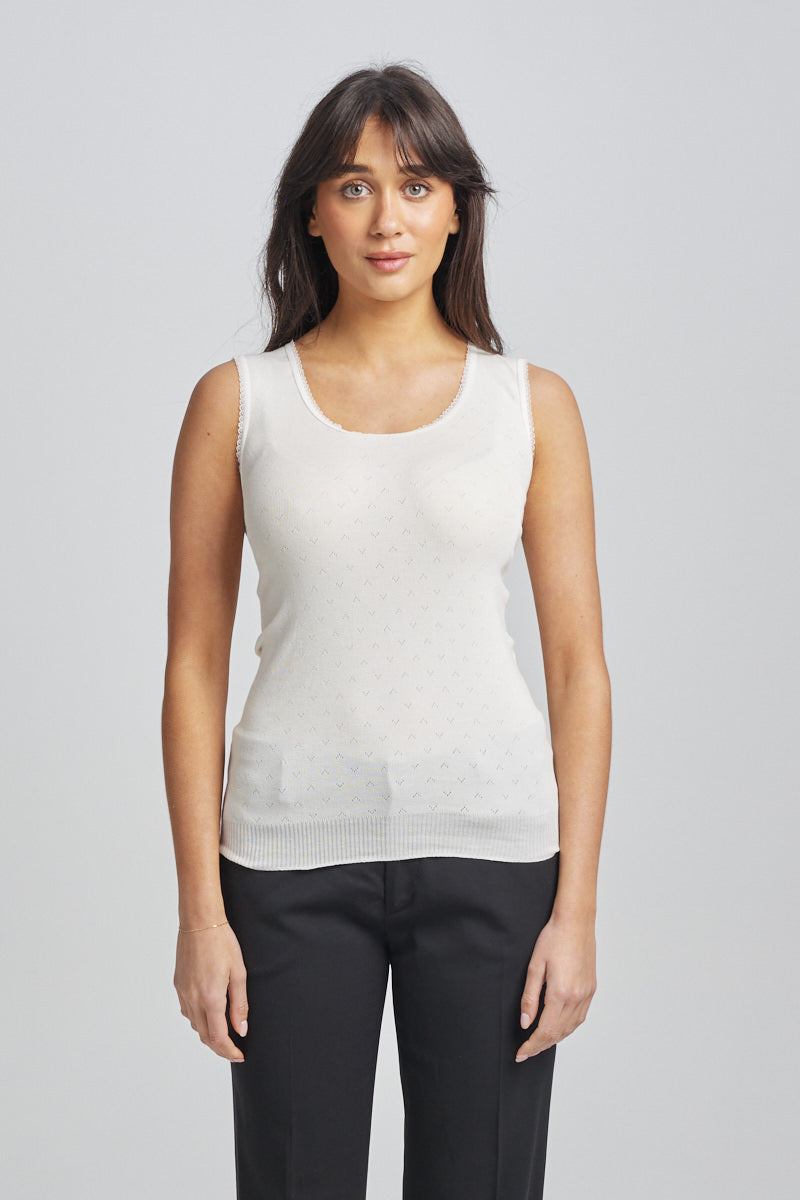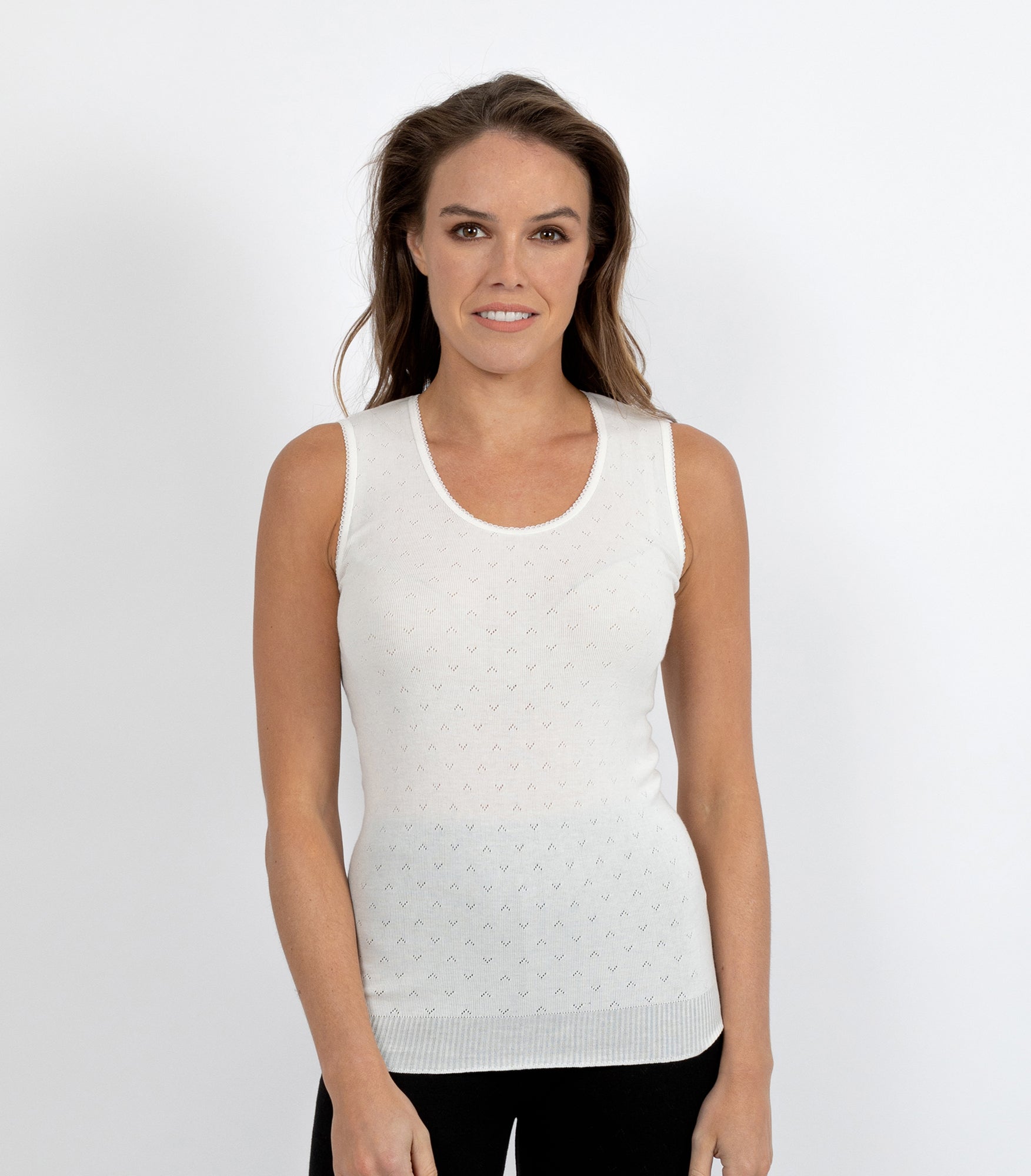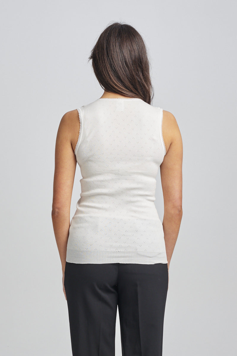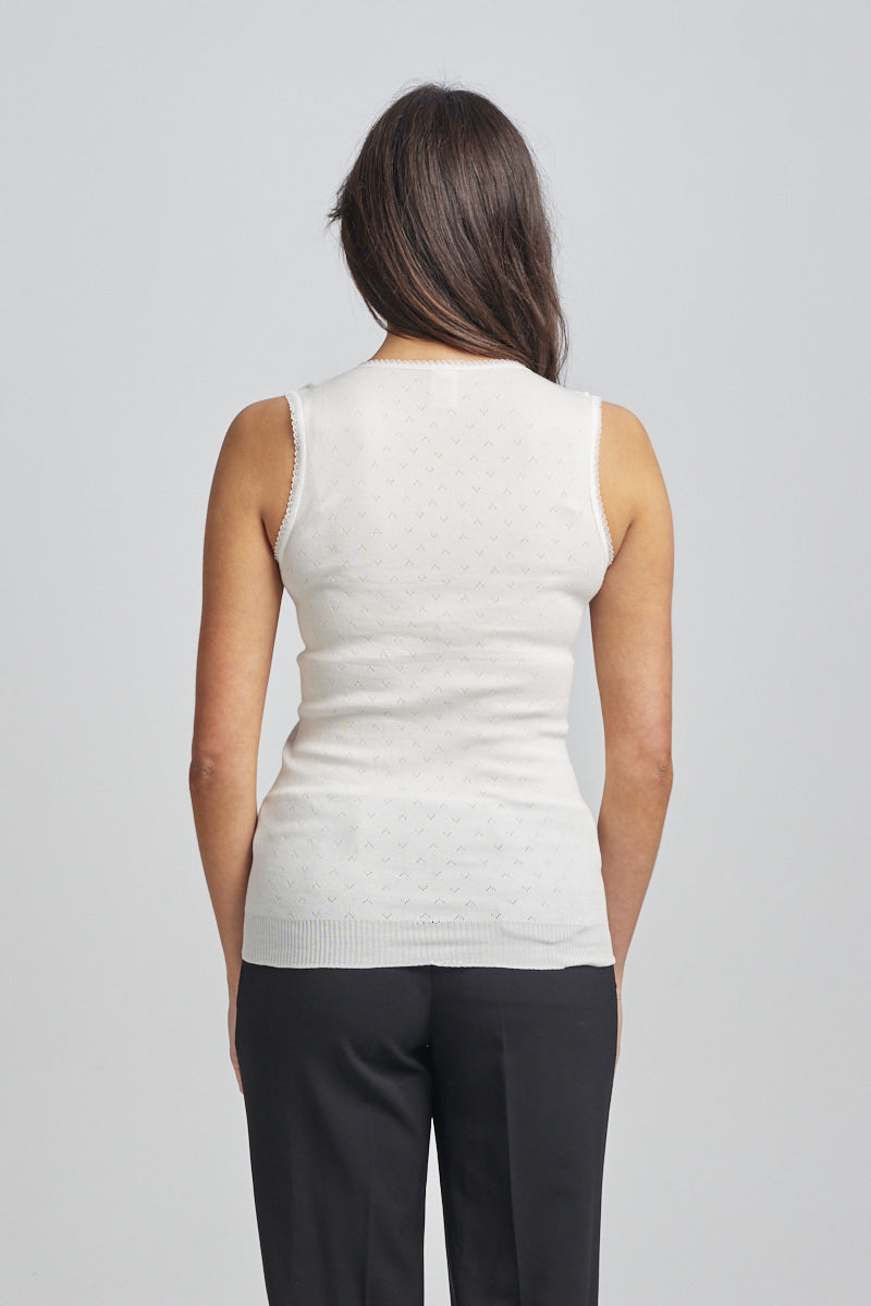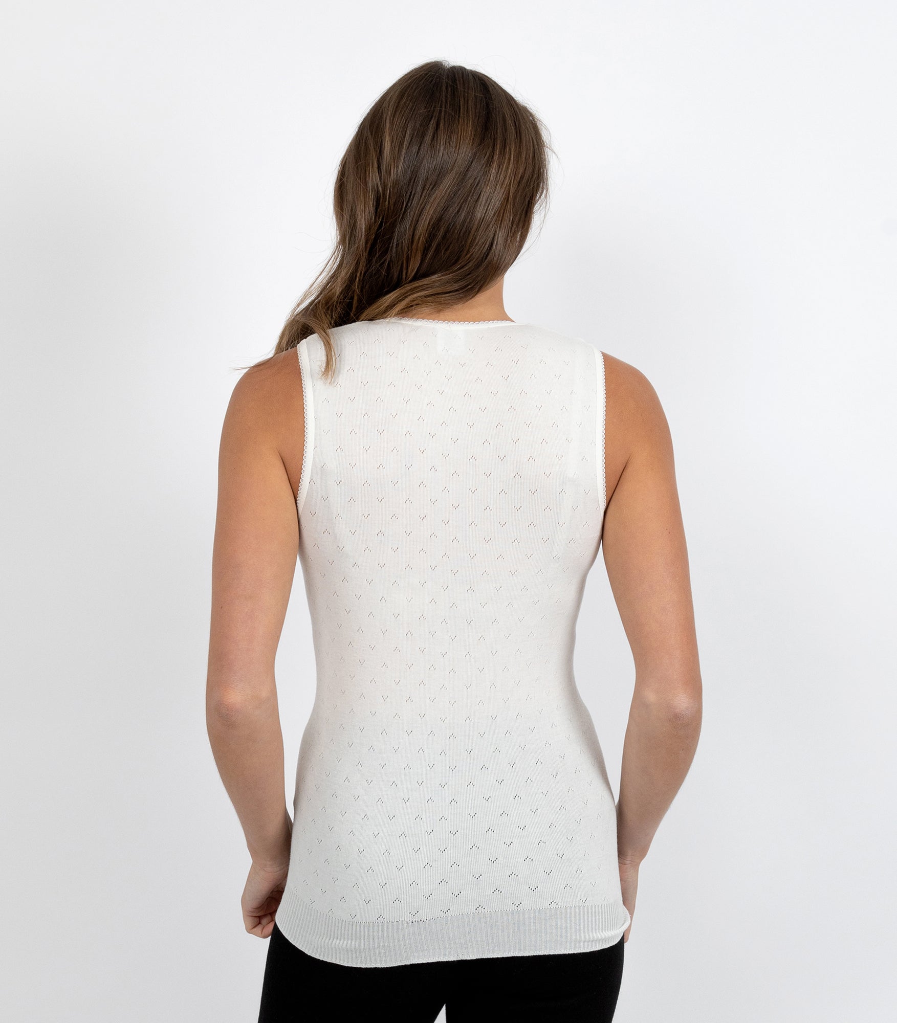 Lightweight thermal vest. Traditional RTR pointelle with knitted in rib band . Side seam free and superb stretch which provides great fit and comfort